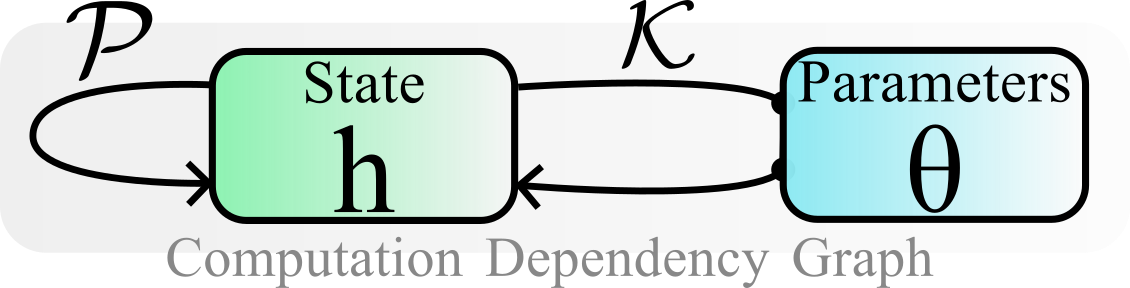 Fig 8 Schematic of computation graph, establishing dependencies in the model. \(\mathcal{K}\) reflects the dependencies emerging from parameters: how do state perturbations filter through parameters, while \(\mathcal{P}\) reflects internal state dependencies.