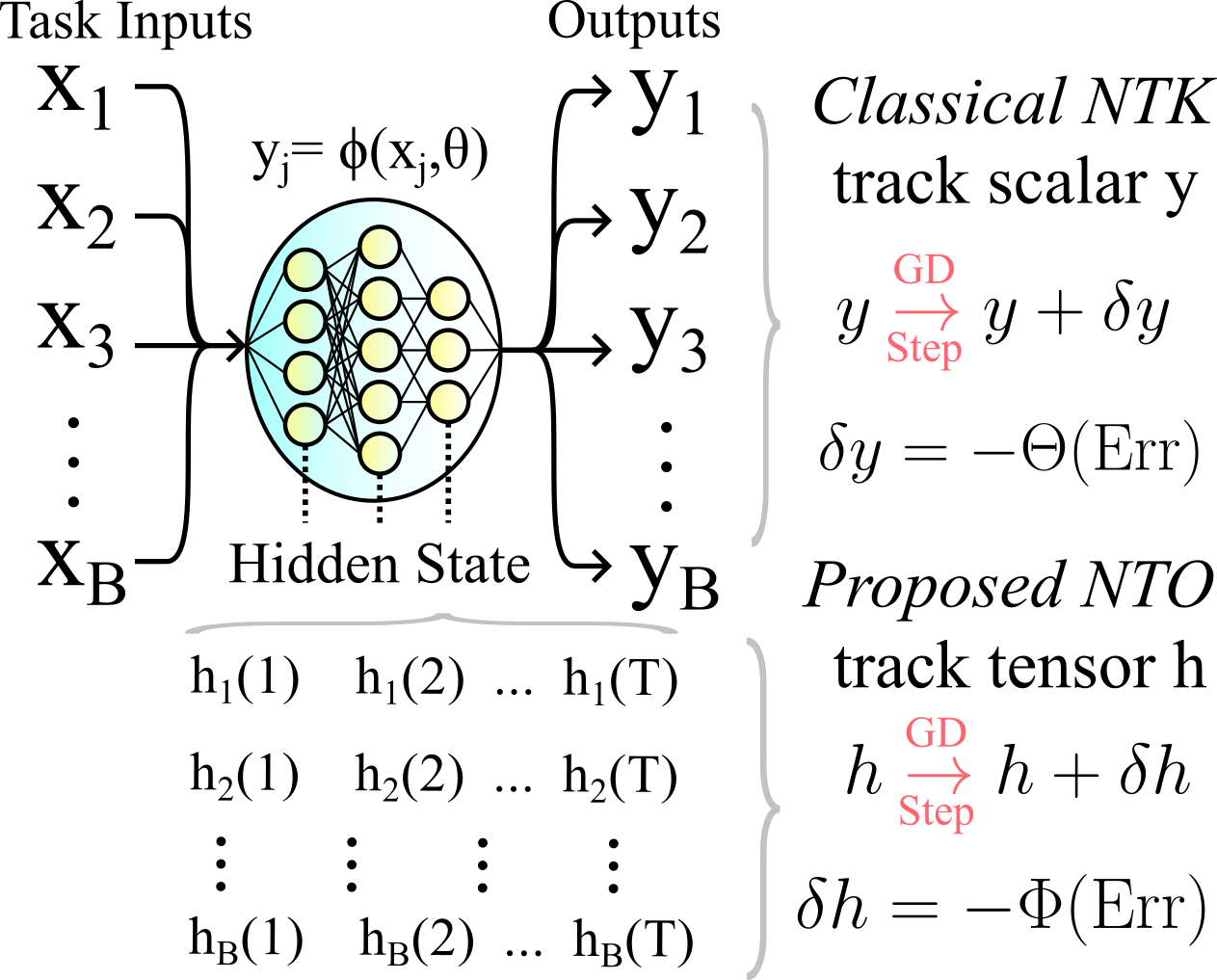 The Classical NTK In the classical NTK literature, the model considered is a multi-layer perceptron neural network with scalar output, so there is no notion of time, \(t\), and no spatial (hidden unit) dimension. Hence, the NTK is just a B by B matrix over all batch input trials. The NTK entries pinpoint how much a GD corrections correlate over batch trials: do corrections to the parameters proposed by two distinct task inputs agree, not overlap at all, or disagree, leading to loss when we do the actual parameter update. I will use the notation \(\Theta\) to denote the NTK. Concretely, if \(y = w^T h\) where \(w\) is a vector, then we can relate the NTO, \(\Phi\), and NTK, \(\Theta\): $$\Theta = w^T \Phi w,$$ i.e. the NTO is the actually complicated part of the whole operator.
