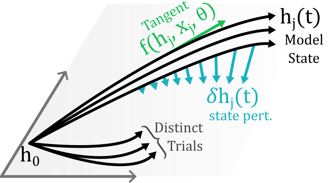 Consider the model state on task input \(x_j\), which is given by simulating the model from time \(0\) to any \(t\), $$h_j(t) = \int_0^t f(h_j(t_0), x_j(t_0), \theta) \text{d} t_0.$$ Then, there is a chain of perturbations leading to the change \(h_j(t)\) to the hidden state on trial \(j\) at time \(t\). Firstly, there is a perturbation, \(\delta \theta\), to the parameters according to the GD step. Next, this gives rise to a perturbation, \(\delta f\), to the tangential dynamics at every time and trial. When there is a discrete number of timesteps T, H hidden units and B task inputs, \(\delta f\) is a tensor of shape [B, T, H]. Finally, these local changes \(\delta f\) are integrated over time to give rise to the true hidden state change.