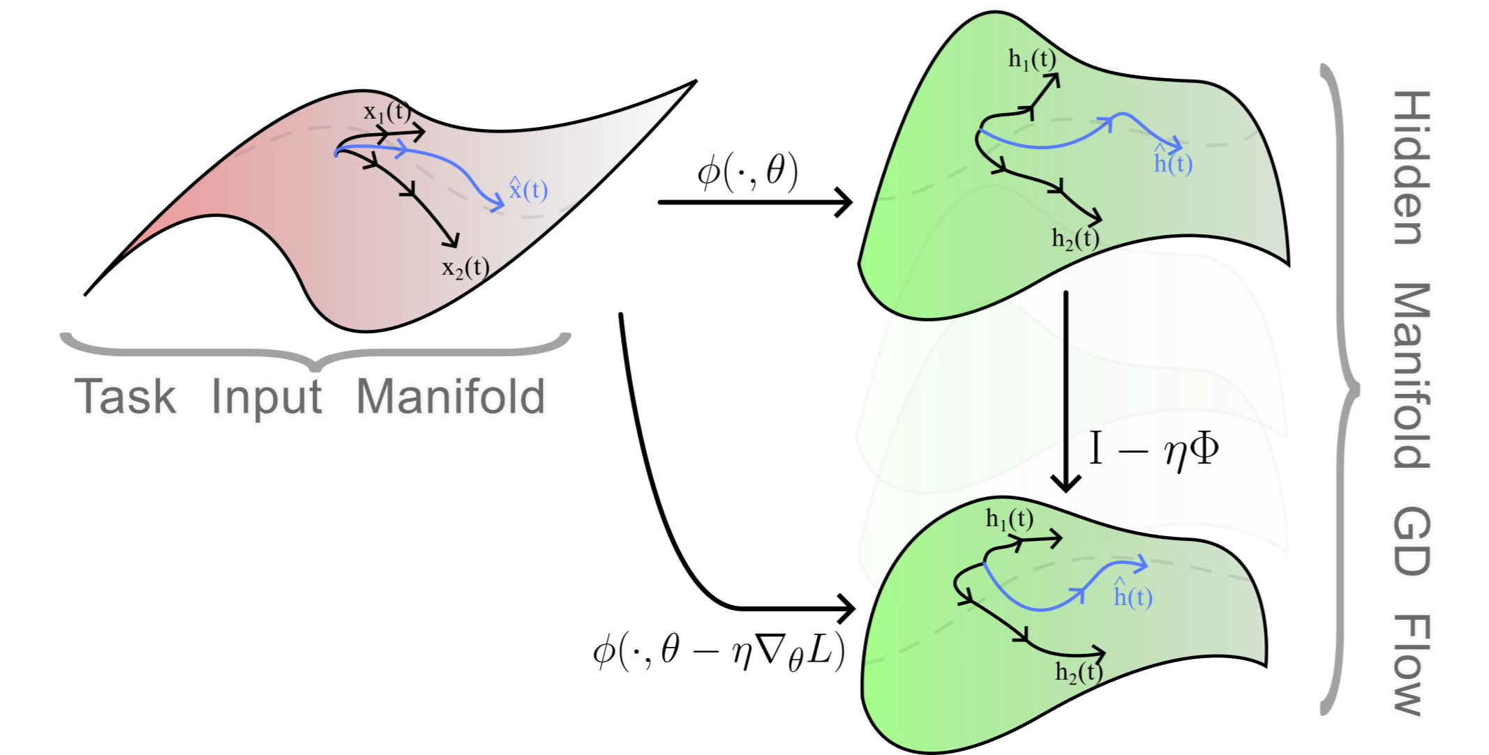 Fig 2 Schematic of network model \(\phi(x, \theta)\), which produces a hidden state over time given input \(x\) and parameters \(\theta\). The hidden state gradient flow (right) describes how the trajectories \(h_j(t)\) evolve. Here, \(\hat x(t)\) is an unseen input during training, and \(\hat h(t)\) is the corresponding hidden state.